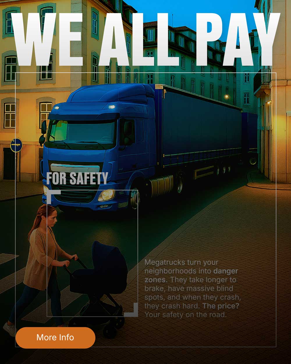 The impacts of megatrucks are not abstract — they affect all of us. Explore the five key areas where longer and heavier vehicles could increase the burden on society: